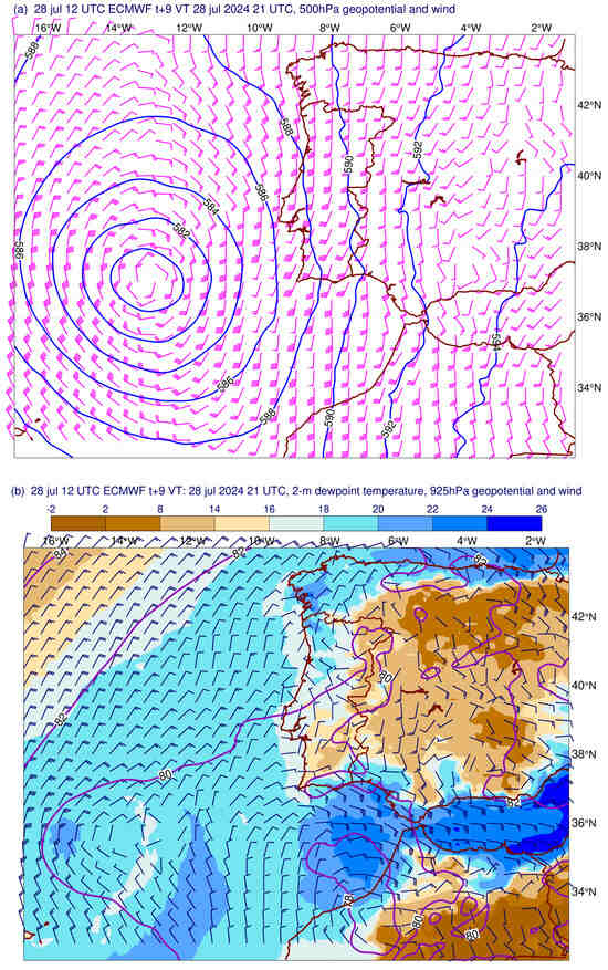 ECMWF forecast valid at 2100 UTC on 21 July 2024, (a) 500 hPa geopotential height (dam) and wind (barbs), (b) 2 m dewpoint temperature and 925 hPa geopotential and wind (barbs).