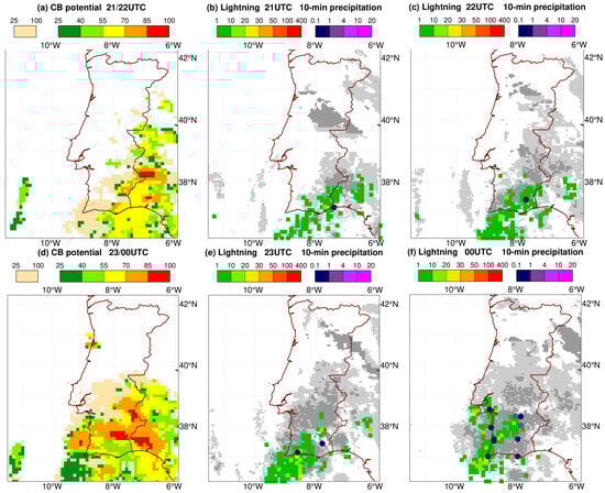 Figure 9a shows that at 2100 UTC and in the next hour, IndexCON predicts a moderate risk of convective activity in the southwest of the Iberian Peninsula and over the Gulf of Cadiz. The comparison between IndexCON and the observed lightning activity reveals good agreement (Figure 9a–c). It is also worth noting that the area of convective activity displayed by IndexCON is considerably smaller than the area depicted by the other indicators (see Figures S2 and S3a). In addition, IndexCON provides a better prediction of the thunderstorm area, highlighted by the lightning observations and high tops (Figure 9a–c), than the other indicators. This illustrates the importance of combining FaCON and funml (see Section 2.2). At 2300 UTC on 28 July 2024, IndexCON discloses an expansion of the area of convective activity over southern Portugal, relative to the previous two hours, in agreement with the observations, despite an apparent slight time lag (Figure 9).