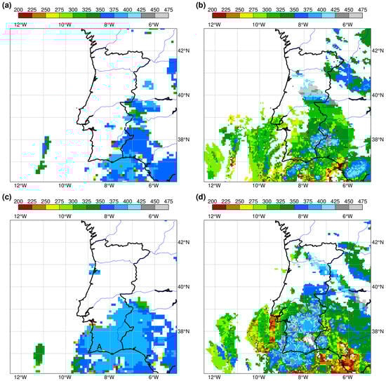 This study also uses a half-hourly 4 km infrared (IR) brightness temperature (BT) dataset, developed by the National Oceanic and Atmospheric Administration (NOAA) and the National Centers for Environmental Prediction (NCEP), which is produced by merging the ~11 µm channel of five geostationary satellites to create a combined IR brightness temperature [57]. In addition, for the case study, the analysis of the Cb product is complemented with data from the cloud top height, which is obtained from the Satellite Applications Facility on Support to Nowcasting and Very Short-Range Forecasting (NWC SAF) software [58]. This product is derived from IR brightness temperature and estimates cloud top height by comparing observed and simulated IR brightness temperatures. The last output is obtained from the NWP’s vertical temperature and humidity profiles [58].