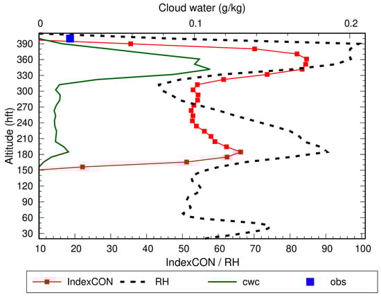 Figure 11 displays the vertical profile of IndexCON at location A (in the south of mainland Portugal; see Figure 10c), showing that IndexCON exceeds 25 in the layer between 165 and 390 hft. As a result, the predicted cloud top altitude is 390 hft, slightly below the estimate from NWCSAF (≈400 hft). This index has maximum values in the layer between 330 and 380 hft, reflecting the presence of high relative humidity and cloud water content. Below 330 hft, the cloud water content is less than 0.015 g kg−1, but the vertical velocity varies between −0.5 and −1.6 Pa s−1 (not shown), and consequently, Mω is equal to 1 (see Figure 4b). Thus, in that layer, Mω plays a relevant role (see Equation (6)).