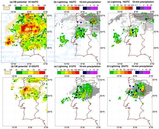 The precipitation and lightning data can be requested on the official website of the Portuguese Weather Service (IPMA—https://www.ipma.pt/en/siteinfo/contactar.jsp, accessed on 3 March 2024). The NOAA/NCEP half-hourly 4 km merged IR brightness temperature dataset is available at https://disc2.gesdisc.eosdis.nasa.gov/data/MERGED_IR/GPM_MERGIR.1/, accessed on 14 October 2024).
