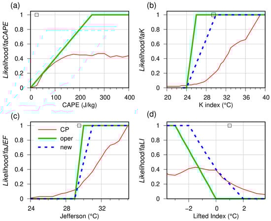 Considering Equations (2)–(5), it is worth noting that, as facMIN represents the minimum value of the membership functions of the instability indices, FaCON can only reach its maximum value when all the membership functions diagnose static instability. Furthermore, FaCON can only reach its maximum value when a certain amount of cloud water content in the column (see Figure 2) coexists with atmospheric instability.