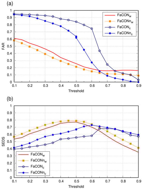 In the warm season, the NSS reaches a maximum value of 1 for IndexCON equal to 25, and above this threshold, the NSS sharply decreases (Figure 7a). Other metrics (the HSS, F1, SEDS and CSI) also reach the maximum values for IndexCON equal to 25. For this threshold, this index captures 70% of the convective events, and for values of IndexCON higher than 35, the probability of detection decreases sharply, attaining values of approximately 30% for IndexCON equal to 60. Figure 7 also reveals that in the warm season, IndexCON performs well, with an FAR of 0.3, SEDS equal to 0.7, CSI equal to 0.55, and HSS and TSS equal to 0.65.