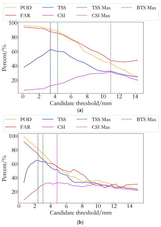 FAR simultaneously, thereby optimizing the threshold selection process and avoiding over-reliance on any single metric. In rainfall event forecasting, the