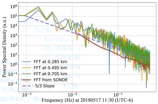 To ensure the comparability of wind-field data between radiosonde and Doppler lidar, this study selects radiosonde wind-field data between 0.2 km and 1 km. We selected vertical wind-field data from Doppler lidar at 0.285 km, 0.495 km, and 0.705 km between 11:00 and 12:00 (UTC-6). FFT was performed on these data, and the results are shown in Figure 2. The FFT spectra for Doppler lidar at altitudes of 0.285 km, 0.495 km, and 0.705 km are very similar. Due to the radiosonde’s limited observation time of less than 100 s, the minimum frequency is greater than 10−2 Hz. This study uses Equation (1) (0.01 Hz to 0.1 Hz) from Section 2.2 to fit the FFTs at the three altitudes; the EDR at 0.285 km, 0.495 km, and 0.705 km are 0.51 m2/s3, 0.42 m2/s3, and 0.70 m2/s3, respectively. The EDR from the radiosonde (200 m to 800 m) is ~1.1 m2/s3. The EDR from radiosonde measurements (1.1 m2/s3) and Doppler lidar (0.42–0.70 m2/s3) at various heights is within the same order of magnitude. This also highlights turbulence heterogeneity. While the EDR averaged across three heights from lidar data, the EDR obtained from radiosonde measurements differ by less than one order of magnitude, and the relative error is about 50%.