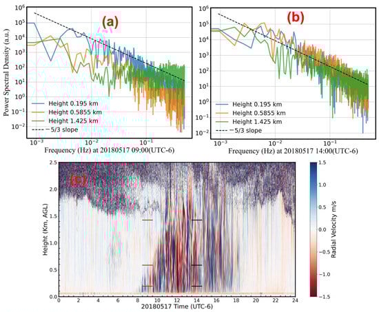 FFT comparison at different times and altitudes on 17 May 2018: (a) FFT around 9:00 a.m. at three different altitudes: 0.195 km, 0.586 km, and 1.425 km; (b) FFT around 2:00 p.m. at three different altitudes: 0.195 km, 0.586 km, and 1.425 km; (c) vertical wind-field data on 17 May 2018 (red represents the three different altitudes around 09:00 in (a); black represents the three different altitudes around 14:00 in (b)).
