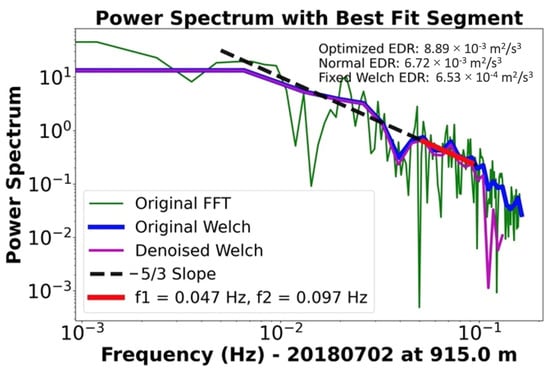 The core idea of the algorithm is to adaptively find the frequency range that satisfies the −5/3 slope, followed by fitting to obtain the EDR. We leverage the advantages of the Welch FFT method, particularly its reduced spectral leakage characteristics. The Welch FFT employs window functions to effectively mitigate spectral leakage, thereby ensuring a more concentrated spectral power distribution at the signal’s actual frequency components. The methodological workflow, as illustrated in Figure 5, comprises the following detailed steps: