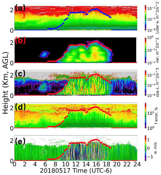 Schematic of the diurnal evolution of the boundary layer based on EDR (from Equation (4) in Section 2.1) and boundary-layer height inversion on 17 May 2018 with red dots indicating the boundary-layer height (MLH). (a) Doppler lidar error, (b) vertical wind variance after wavelet analysis, (c) turbulent dissipation rate, (d) relative error, (e) vertical wind field from Doppler lidar.