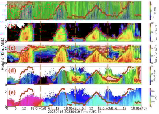 Due to the influence of the LLJ, not only does the LLJ develop at night, but it also significantly impacts boundary-layer development during the day. In the morning, when the boundary layer begins to rise, turbulence is easily generated via windshear, which in turn influences the boundary layer’s development. For example, around 09:00 (UTC-6) on 17 April, we can clearly see a noticeable jump in the MLH, which is mirrored by a similar jump in EDR (Figure 7c) at the same time (around 800 m). Observing Figure 7d, we notice that, at this moment, the horizontal wind speed near the surface is less than 10 m/s, but the ABL top (MLH) corresponds to a wind speed close to 20 m/s, indicative of a typical LLJ structure. At this point, the MLH jumps directly from near the surface to around 800 m. Additionally, between 10:00 and 11:00 on 18 April 2023, clear gravity waves are observed, including both updrafts and downdrafts. After the gravity waves, the ABL continues to develop slowly. On the morning of 19 April, between 10:00 and 11:00, a distinct updraft is visible, primarily originating from the top of the ABL. Due to the persistent updraft, the MLH rapidly develops from 1.0 km to 1.5 km. The development of the ABL on 16 April follows a typical pattern, but on 19 April, due to the influence of the LLJ, the LLJ not only develops at night but also has a significant impact on the ABL development during the day.