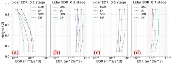 The development of the median EDR exhibits distinct characteristics across different seasons. As shown in Figure 8c, summer (JJA) exhibits significantly higher median EDR values (~6.8 × 10−3 m2/s3) compared to other seasons. This result is consistent with the findings of Bodini et al. [35], although their analysis was limited to fixed altitudes and did not include comparisons across different heights. Additionally, at the 0.7 stage after sunrise, the median EDR begins to decrease across all four seasons, indicating that the median EDR weakens in the later afternoon. Notably, DJF initially exhibits the lowest median EDR values (~3.8 × 10−4 m2/s3 in Figure 8a), but subsequently shows a gradual increase. At the 0.3 stage (Figure 8b), DJF EDR almost catches up with SON (~2 × 10−3 m2/s3), and by the 0.5 stage (Figure 8c), DJF surpasses SON (~1.7 × 10−3 m2/s3 vs. ~1.1 × 10−3 m2/s3, respectively). At the 0.7 stage (Figure 8d), DJF EDR further exceeds MAM (~1.5 × 10−3 m2/s3). This trend suggests that EDR within the ML in DJF continues to develop, despite lower temperatures, and does not remain weaker than in spring or autumn. This phenomenon may be attributed to the lower MLH during DJF, where a comparable level of heat flux is concentrated within a reduced vertical extent, thereby enhancing EDR generation. Even with diminished surface fluxes, a lower MLH (smaller volume) can contribute to stronger EDR. Furthermore, the observed pattern remains consistent across different EDR algorithms, as demonstrated by the similar results from both Formula (4) and the enhanced algorithm detailed in Section 3.3. Due to space constraints, EDR results from Formula (4) are not presented in the manuscript.