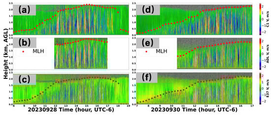 Comparison of vertical velocity between SGP sites and ADL. ADL at C1 on 28 September 2023: the three subfigures are vertical velocity from (a) SGP C1 Doppler lidar, (b) ADL (near C1 site), and (c) SGP E37 Doppler lidar. ADL at E37 on 30 September 2023: the three subfigures are vertical velocity from (d) SGP C1 Doppler lidar, (e) ADL (near E37 site), and (f) SGP E37 Doppler lidar. The red dots are MLHs.
