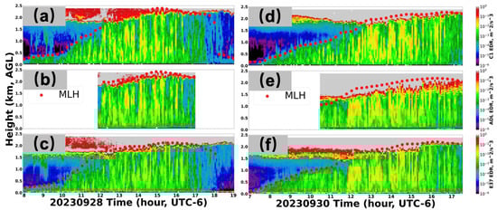 Comparison of EDR (from Equation (4)) between SGP sites. (a–c) ADL at C1 on 28 September 2023: the three subfigures are EDR from (a) SGP C1 Doppler lidar, (b) ADL (near C1 site), and (c) SGP E37 Doppler lidar. (d–f) ADL at E37 on 30 September 2023: EDR from (d) SGP C1 Doppler lidar, (e) ADL (near E37 site), and (f) SGP E37 Doppler lidar. The red dots are MLHs.