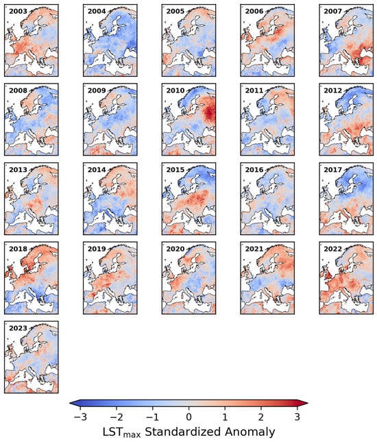 - Standardized Anomaly: the standardized LSTmax anomaly was computed by subtracting the long-term (2003–2022) annual mean of LSTmax (LSTmax,mean) from the daily LSTmax values, and then dividing by the corresponding annual standard deviation (LSTmax,std):