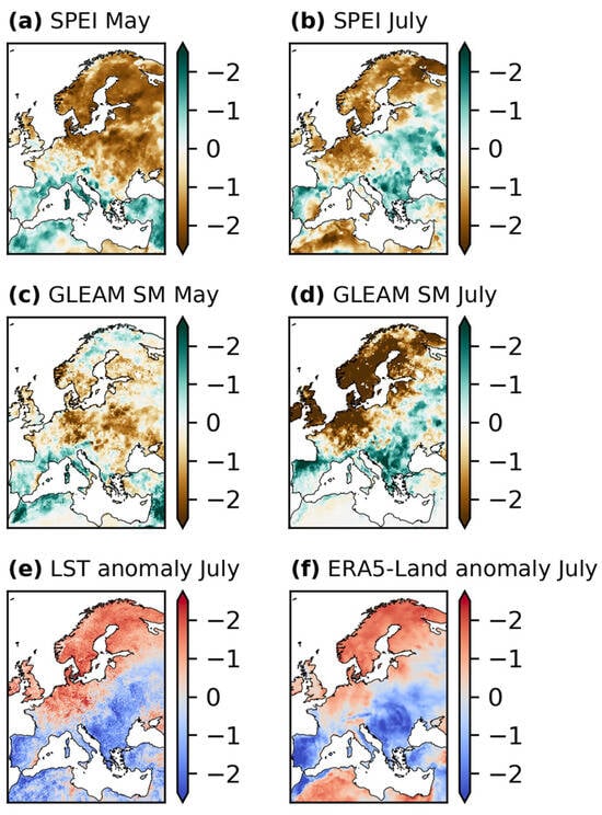 - Fischer, E.M.; Seneviratne, S.I.; Vidale, P.L.; Lüthi, D.; Schär, C. Soil Moisture–Atmosphere Interactions during the 2003 European Summer Heat Wave. J. Clim. 2007, 20, 5081–5099. [Google Scholar] [CrossRef]