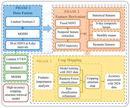 Overview of the proposed workflow for regional crop mapping. The workflow comprises three phases: (1) Data fusion: Landsat-5/7/8/9 and Sentinel-2 are fused with MODIS to generate a 30 m, 8-day NDVI time series. (2) Feature derivation: Statistical features (8-day composites, monthly means) and dynamic trajectory features are extracted from the fused NDVI. (3) Crop mapping: This includes model training with 2023 data, RF classification with post-classification refinement, feature-importance analysis (SHAP), and accuracy assessment using 2024 data.