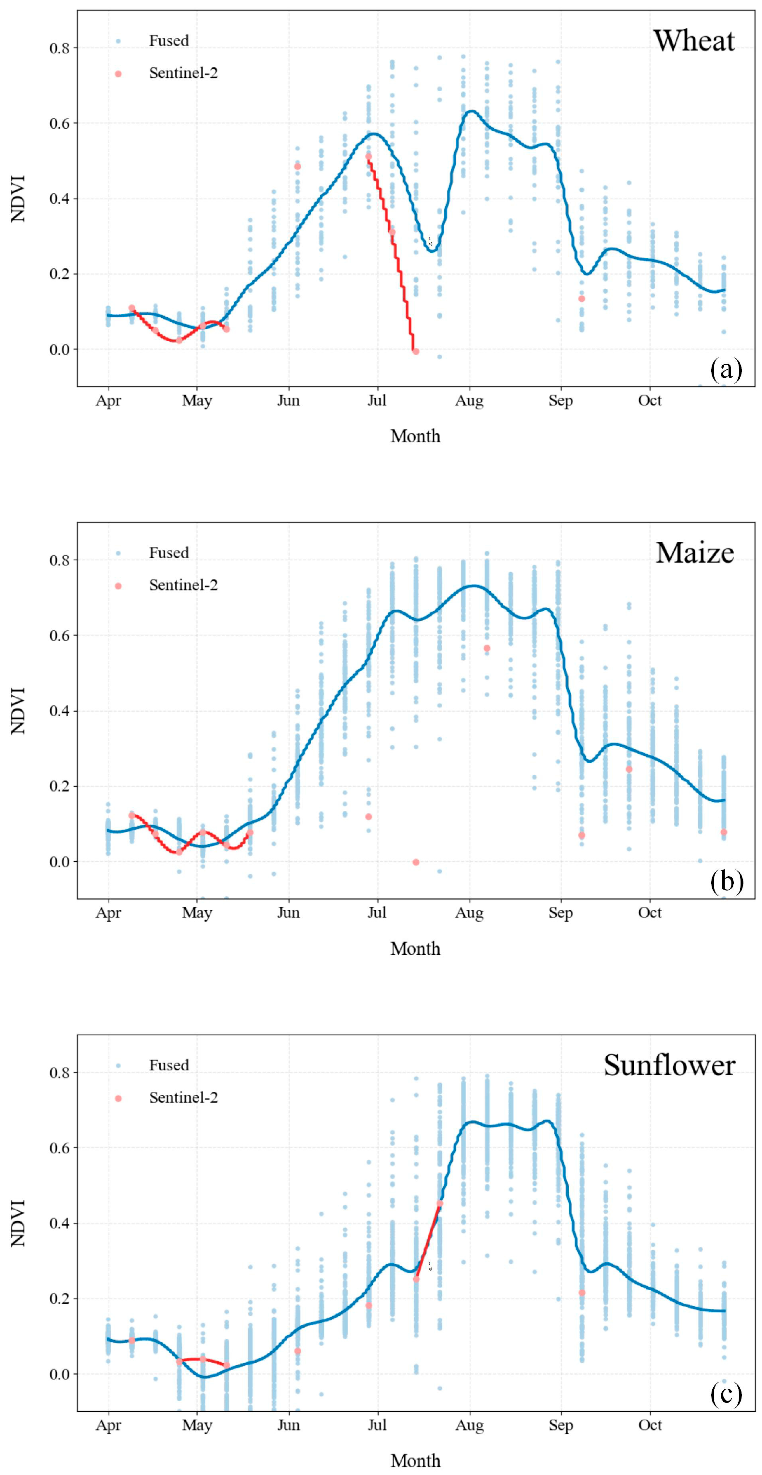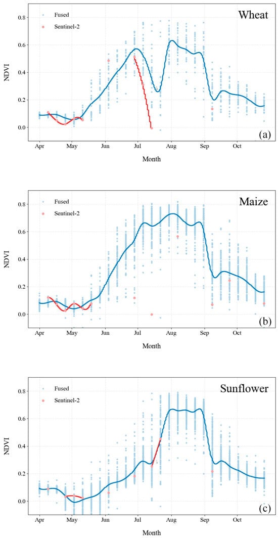 Class-specific NDVI trajectories derived from 2023 field-labeled samples using the fused Landsat–Sentinel-2–MODIS time series (30 m, 8-day; blue) compared with Sentinel-2 observations (red; 10 m, irregular). (a) Wheat; (b) Maize; (c) Sunflower. The fusion product reduces cloud-induced gaps and high-frequency noise while retaining peak magnitude and timing. Axes: Month (x-axis) and NDVI (unitless, y-axis).