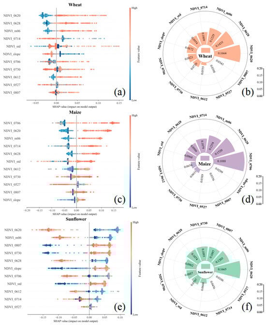 SHAP-based interpretation of crop classification using STARFM-fused NDVI. Caption. Panels (a,c,e) show SHAP summary plots for the RF classifier trained on 30 m STARFM-fused NDVI, for wheat, maize and sunflower, respectively. The x-axis is the SHAP value (impact on model output); point color encodes the feature value (red = high, blue = low). Panels (b,d,f) present radial bar charts of the mean absolute SHAP values for the top contributing features in each class. Results are computed from 1000 randomly sampled pixels within the study area.