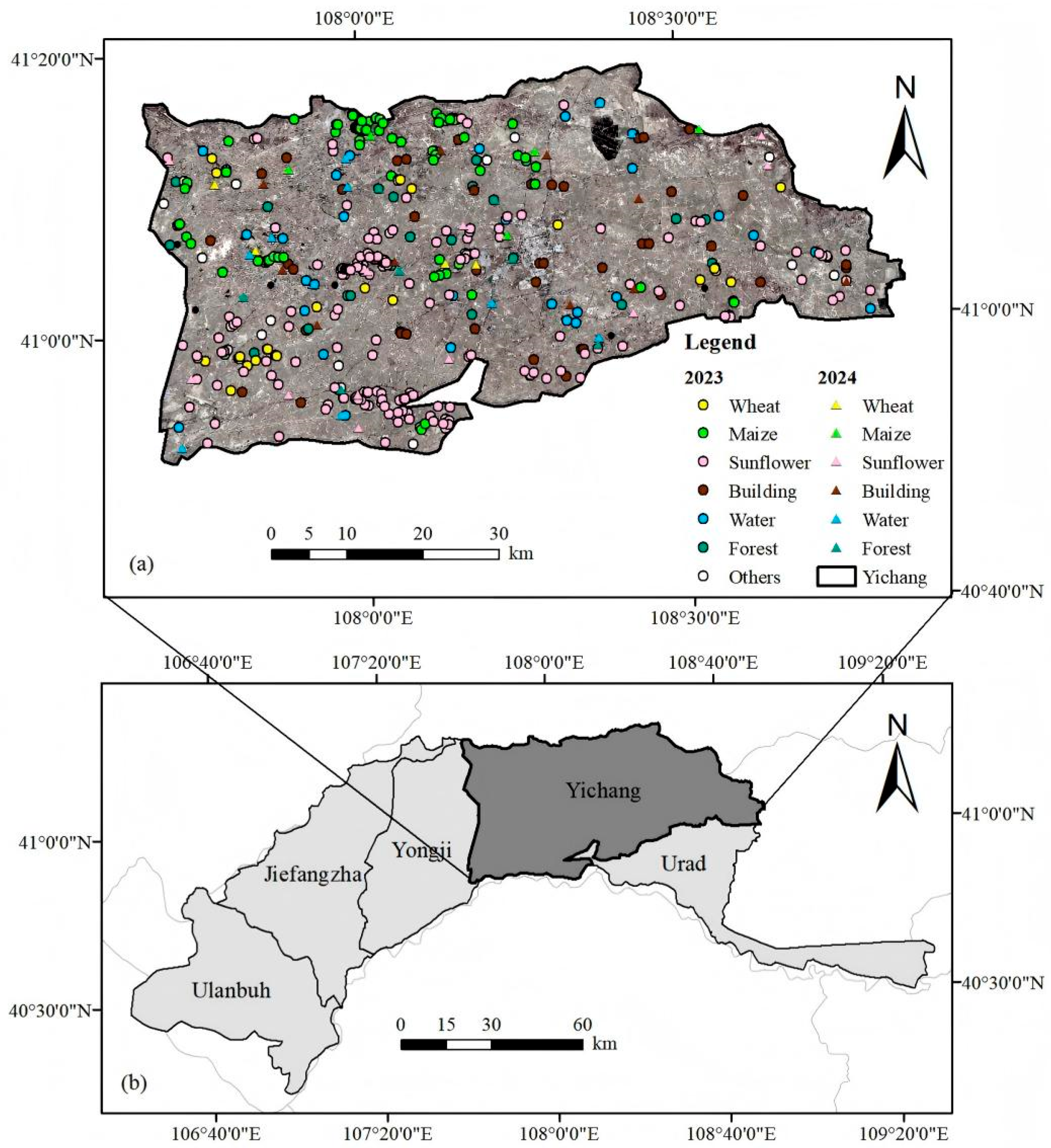 Overview of the study area. (a) Spatial distribution of ground-truth crop samples collected in 2023 and 2024 within the Yichang Irrigation District, including wheat, maize, sunflower, and non-crop classes. Sampling points represent field-level observations used for model training (2023) and independent validation (2024). (b) Geographic location of the Yichang Irrigation District (dark gray) within the broader Hetao Irrigation District, together with adjacent sub-regions (Yongji, Urad, Jiefangzha, and Ulanbuh). The inset outlines the Yichang subarea corresponding to panel (a).