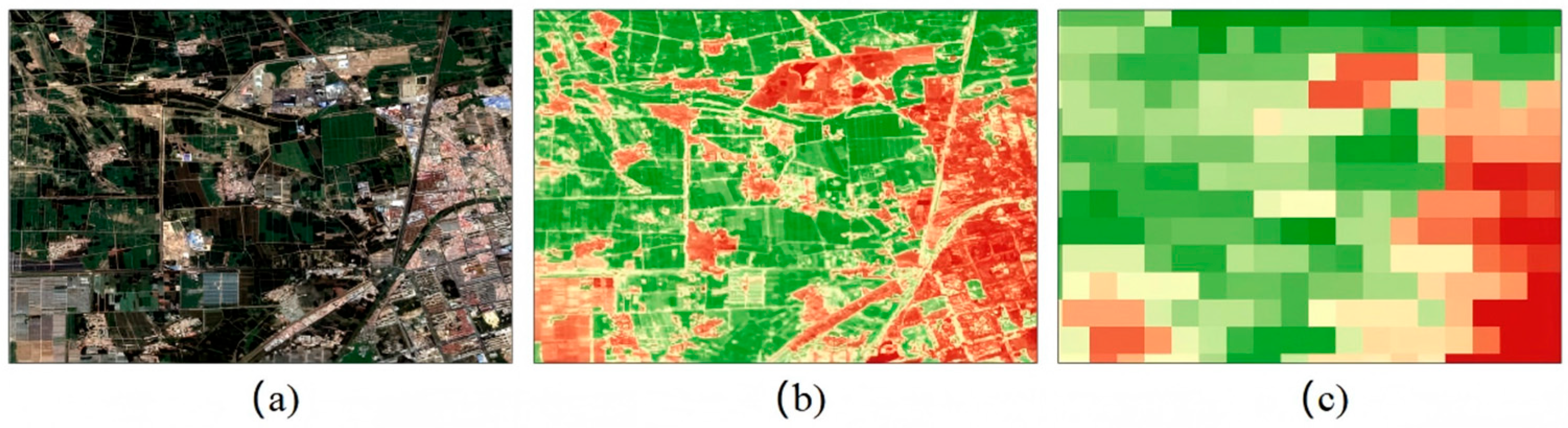 Spatial detail and radiometric consistency of the fused NDVI product (30 m, 8-day) compared with MODIS (500 m). (a) Reference true-color image; (b) Fused NDVI (Landsat–Sentinel-2–MODIS, STARFM); (c) MODIS NDVI. The fusion sharpens parcel boundaries, resolves field roads and settlements, and preserves regional gradients without block-type artifacts, yielding more reliable inputs for field-scale crop mapping and change detection.