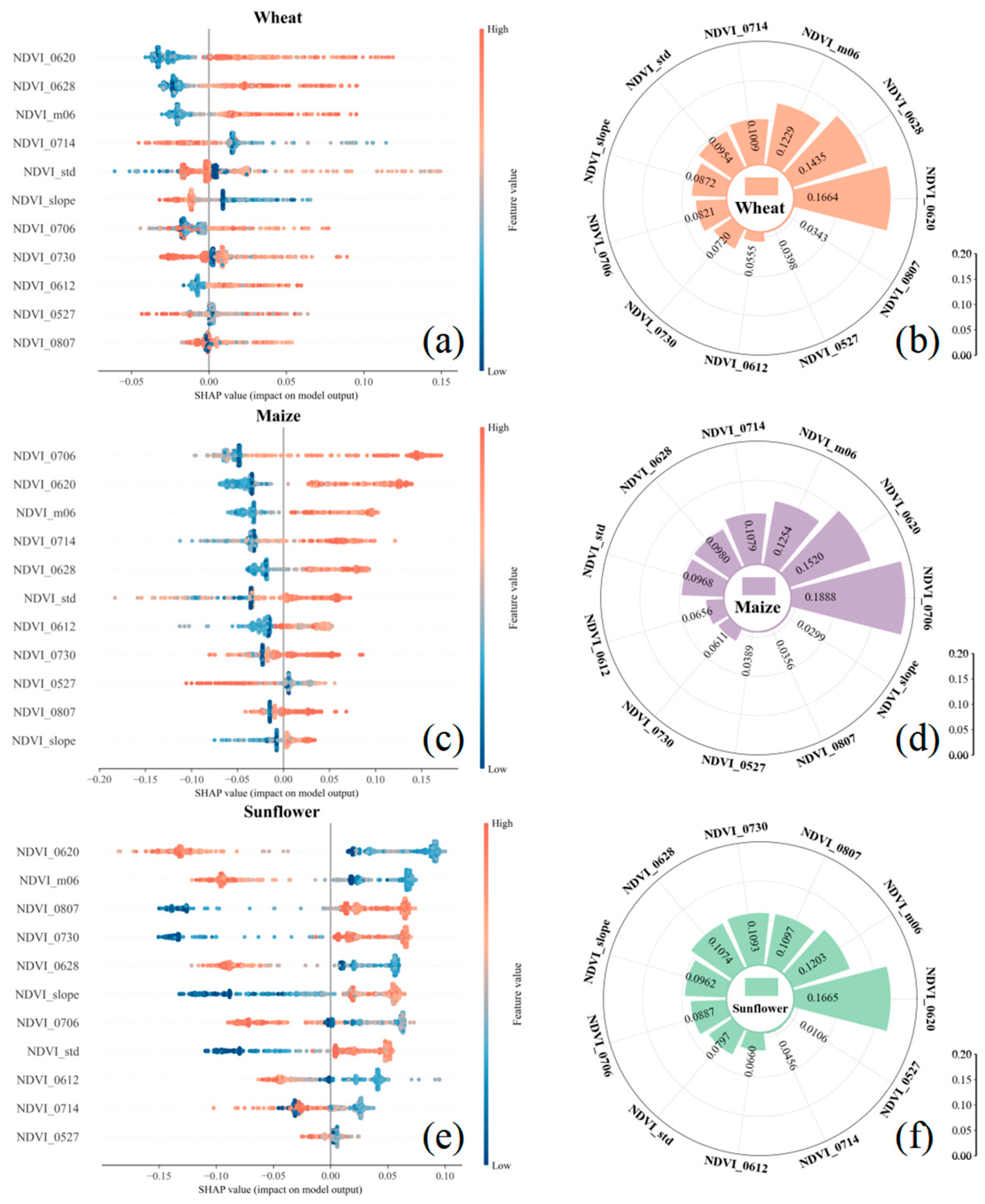 Overall, the SHAP results indicate that late-June to early-August NDVI dynamics provide the most effective separation among wheat, maize, and sunflower. Wheat declines rapidly in early July, maize maintains a stable high plateau through July–August, and sunflower increases sharply after mid-July. NDVI_std further differentiates maize—which shows relatively stable seasonal trajectories—from wheat and sunflower, which exhibit greater intra-seasonal variability. These feature-level distinctions enable accurate discrimination among crops and support reliable reconstruction of spatial–temporal planting patterns.