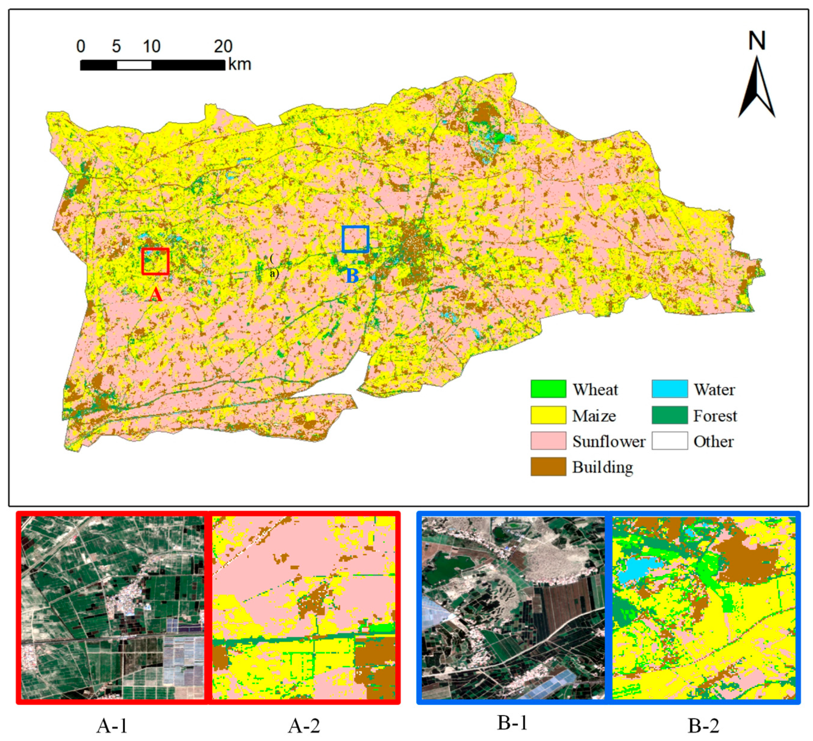 Two typical sub-regions (A and B) were selected to illustrate the classification performance. Sub-region A represents a peri-urban mixed landscape. The classification shows high consistency with the high-resolution imagery (A-1) in terms of field geometry and canal bank alignment. Crops are clearly distinguished from built-up areas, and wheat–maize intercropping is accurately captured. Sub-region B, located in a canal–field transition zone, retains fine linear features such as narrow water bodies, with crop boundaries well aligned with field edges, demonstrating high fidelity at the parcel-level. Using visually interpreted reference data and independent field sample points for accuracy assessment, the classification achieves an overall accuracy of 90.78% and a kappa coefficient of 0.882, indicating high reliability.