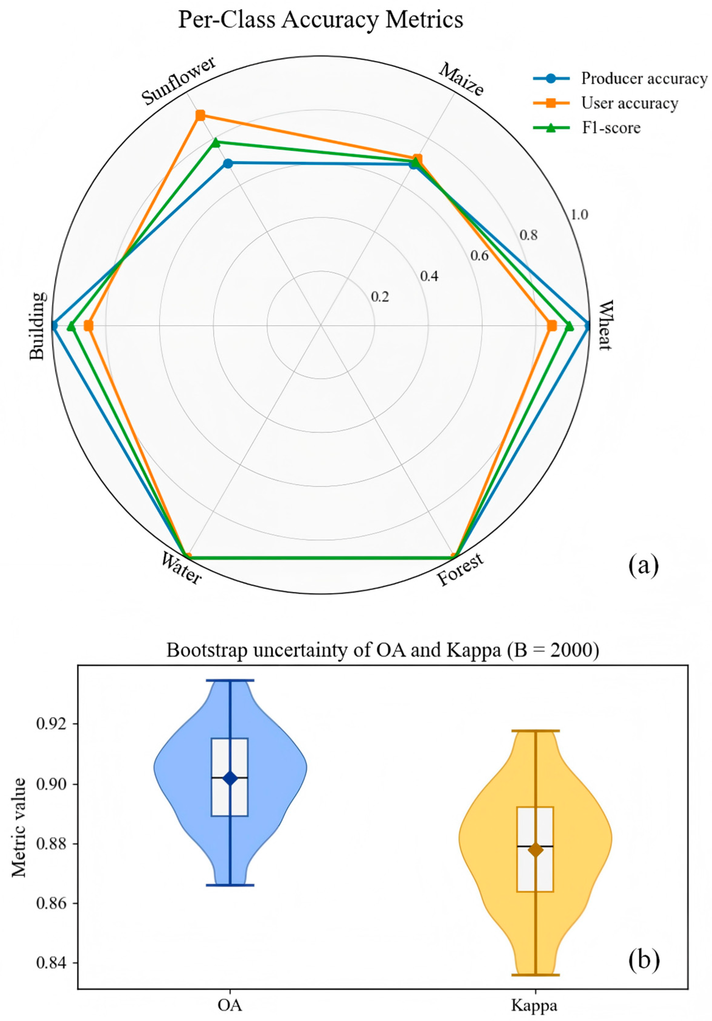 (a) Per-class accuracy metrics of five land-cover categories (Maize, Sunflower, Building, Water, and Forest), showing the Producer’s accuracy, User’s accuracy, and F1-score derived from the independent 2024 validation samples. (b) Bootstrap-based uncertainty assessment of OA and kappa coefficient using 2000 bootstrap resamples, where the violin shapes represent the distribution, and the enclosed markers denote the median and the 95% confidence interval.