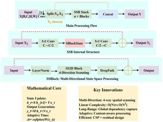 SSB is the core building block of DSSM, combining the efficiency of traditional Bottleneck structures and the powerful feature modeling capability of SSBlock. Its mathematical expression is shown in Equation (2), where represents a k × k convolution layer (k is typically set to 3), and FSSBlock represents the SSBlock operation