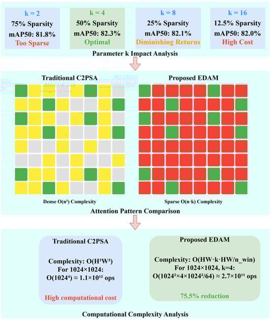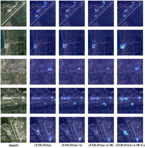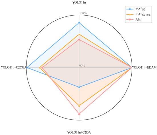 The results demonstrate that EDAM module achieved optimal performance across all key performance indicators. Compared to YOLO11n model, the improved model integrating EDAM increased mAP50 from 80.2% to 81.4%, and significantly improved the more challenging mAP50:95 evaluation standard from 42.1% to 43.7%, an increase of 1.6 percentage points. In terms of small object detection performance (APs) critical for remote sensing images, the EDAM model reached 42.8%, an improvement of 2.0 percentage points over the baseline, outperforming all comparison models. While achieving these performance improvements, EDAM added only a minimal number of parameters, and the computational complexity remained unchanged, demonstrating an excellent efficiency ratio. Although C2CGA performed similarly to EDAM in terms of mAP50, it was significantly inferior in Small object detection and the more stringent mAP50:95 metric; while C2DA performed poorly in terms of mAP50, despite being relatively good in the APs metric. Results fully demonstrate that the EDAM module effectively addressed the core challenges of remote sensing small object detection through its dual-level routing attention mechanism, achieving an optimal balance between performance and efficiency.