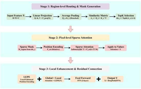 This design reduces computational complexity from O(k2) to O(k) by decomposing large two-dimensional convolutions into a series of one-dimensional convolution operations, while maintaining the feature capture capability of an equivalent 11 × 11 receptive field. The resulting attention map is applied to multi-scale features through residual connections. Finally, enhanced features are mapped to the output space through channel fusion transformation, as shown in Equation (12), where WO and bO are learnable parameters.