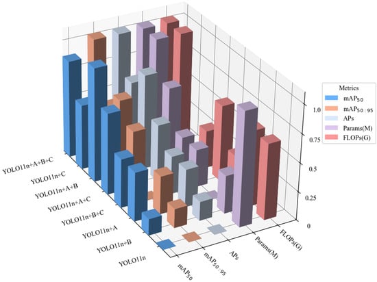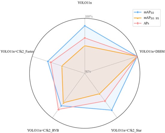 The results show that our proposed DSSM significantly enhanced model performance. In terms of evaluation metrics, compared to the baseline YOLO11n, the improved model integrating DSSM increased mAP50 from 80.2% to 81.3%, an improvement of 1.1 percentage points; on the more stringent mAP50:95 evaluation metric, it increased from 42.1% to 44.3%, an improvement of 2.2 percentage points; particularly in Small object detection performance (APs), it increased from 40.8% to 42.3%, an improvement of 1.5 percentage points. This improvement is especially important as it addresses the core challenge of small object detection.