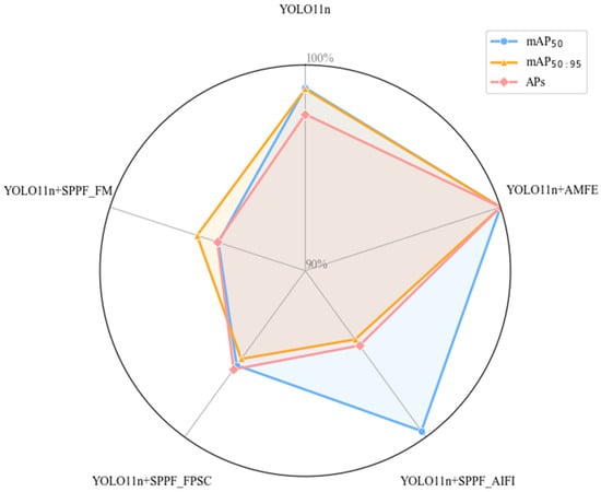 The results indicate that our proposed AMFE module achieved significant improvements across all performance indicators. Compared to YOLO11n, the improved model integrating AMFE increased mAP50 from 80.2% to 81.1%, an improvement of 0.9 percentage points; on the more challenging mAP50:95 evaluation metric, it increased from 42.1% to 42.6%, an improvement of 0.5 percentage points; particularly in Small object detection performance (APs), it increased from 40.8% to 41.8%, an improvement of 1.0 percentage point, which is crucial for remote sensing Small object detection. While achieving these performance improvements, AMFE added only a minimal number of parameters and computational complexity, maintaining the lightweight and efficient characteristics of the model. In contrast, other improvement modules such as SPPF_AIFI, although showing a slight improvement in mAP50, significantly increased parameters and actually decreased small object detection performance; SPPF_FPSC and SPPF_FM performed worse than the baseline model on multiple indicators. These comparisons fully demonstrate the unique advantages of the AMFE module in enhancing feature expression capabilities and multi-scale small object detection through its large separable convolution attention mechanism.
