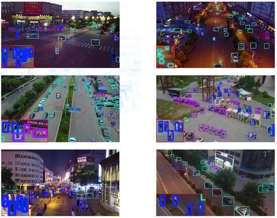 Figure 20 shows the detection results of the DAE-YOLO model on the VisDrone2019 dataset, confirming the model’s excellent performance in multi-class object detection. The model successfully achieved high-precision detection in complex and variable urban environments, and maintained stable detection performance under different lighting conditions, demonstrating its strong adaptability to environmental changes. Additionally, the model exhibited high detection robustness in handling complex scenes with different perspectives, distances, and partial occlusions. These results indicate that DAE-YOLO has significant advantages in processing multi-scale, multi-class object detection tasks in real-world environments.