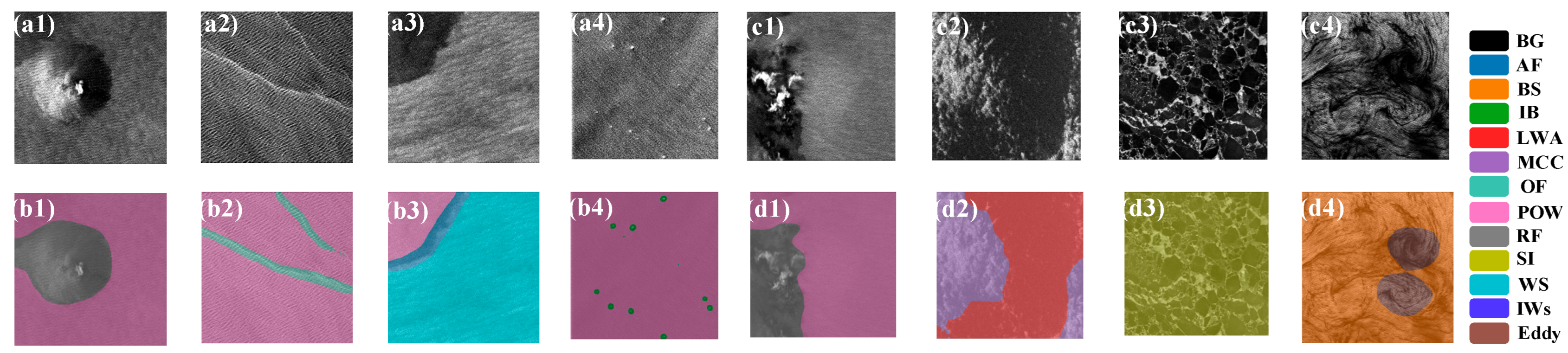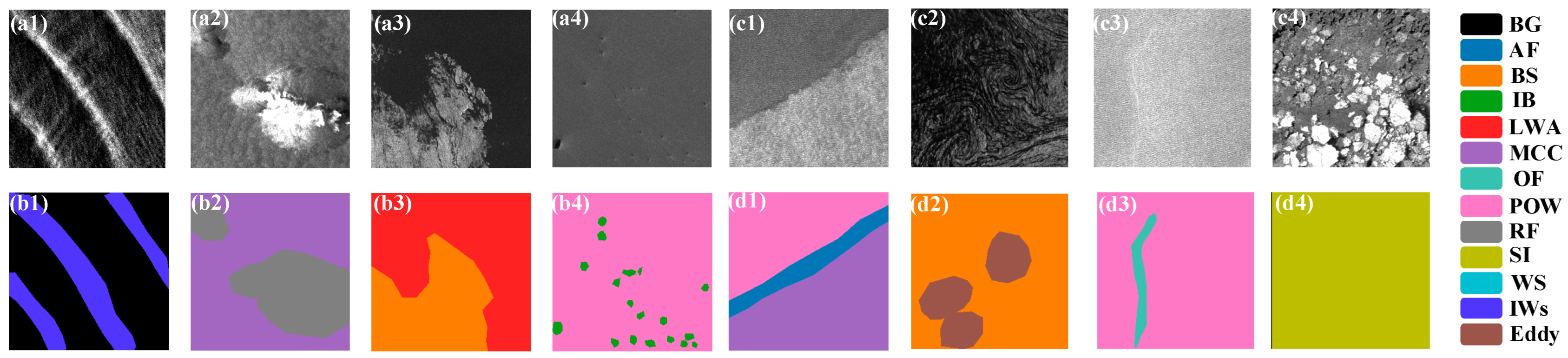 - Quankun, L.; Xue, B.; Xupu, G. A Dataset for Semantic Segmentation of Typical Oceanic and Atmospheric Phenomena from Sentinel-1 Images; Zenodo: Geneva, Switzerland, 2024. [Google Scholar] [CrossRef]