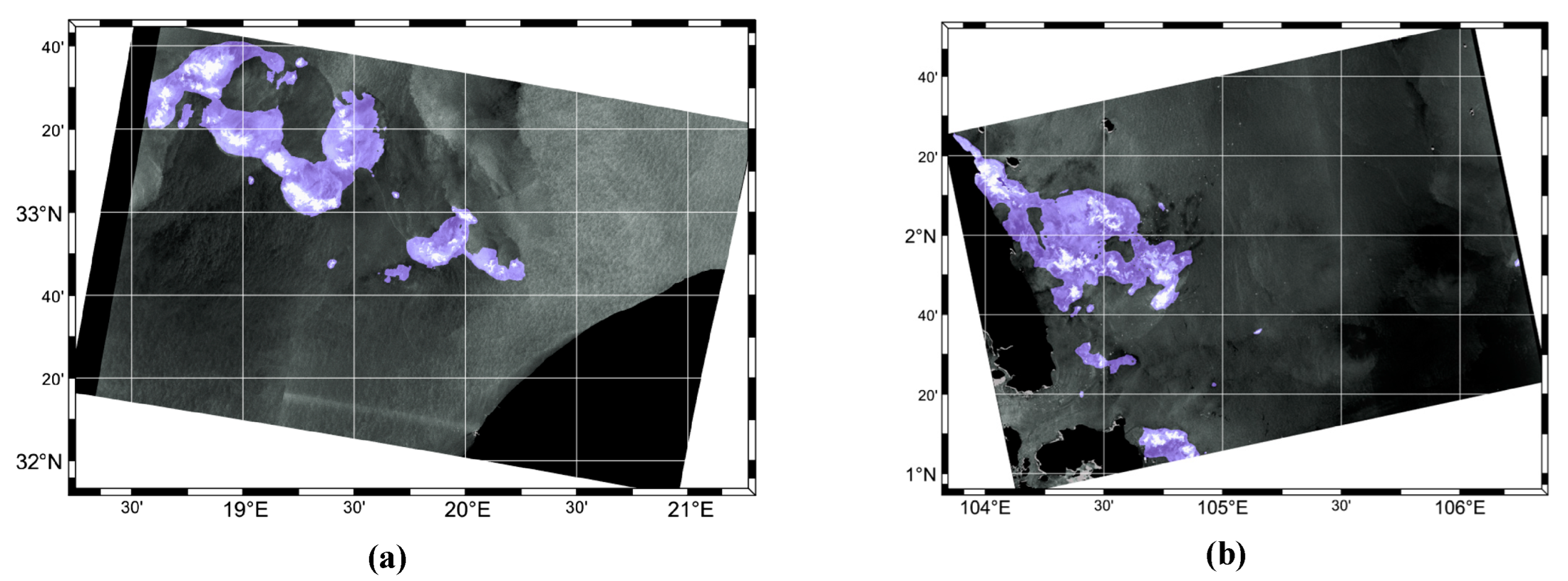 - Chen, J.; Sun, J.; Yang, J. Typical Ocean Features Detection in SAR Images. In Proceedings of the 2008 International Workshop on Education Technology and Training & 2008 International Workshop on Geoscience and Remote Sensing, Shanghai, China, 21–22 December 2008. [Google Scholar]