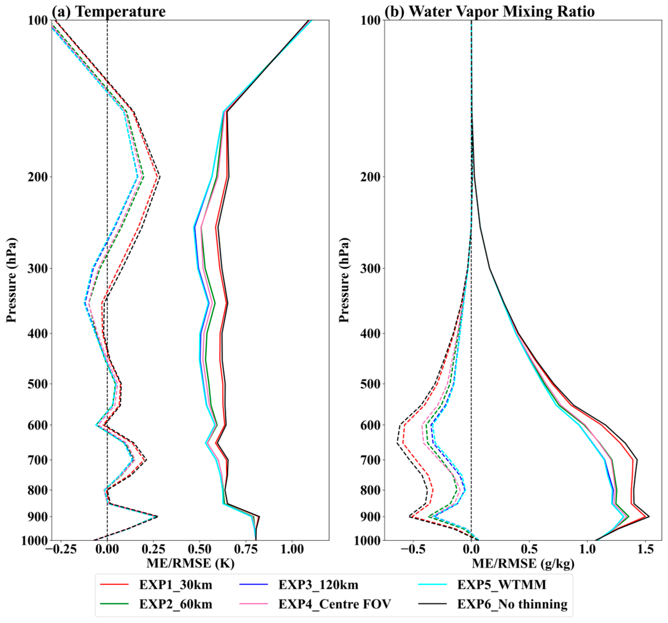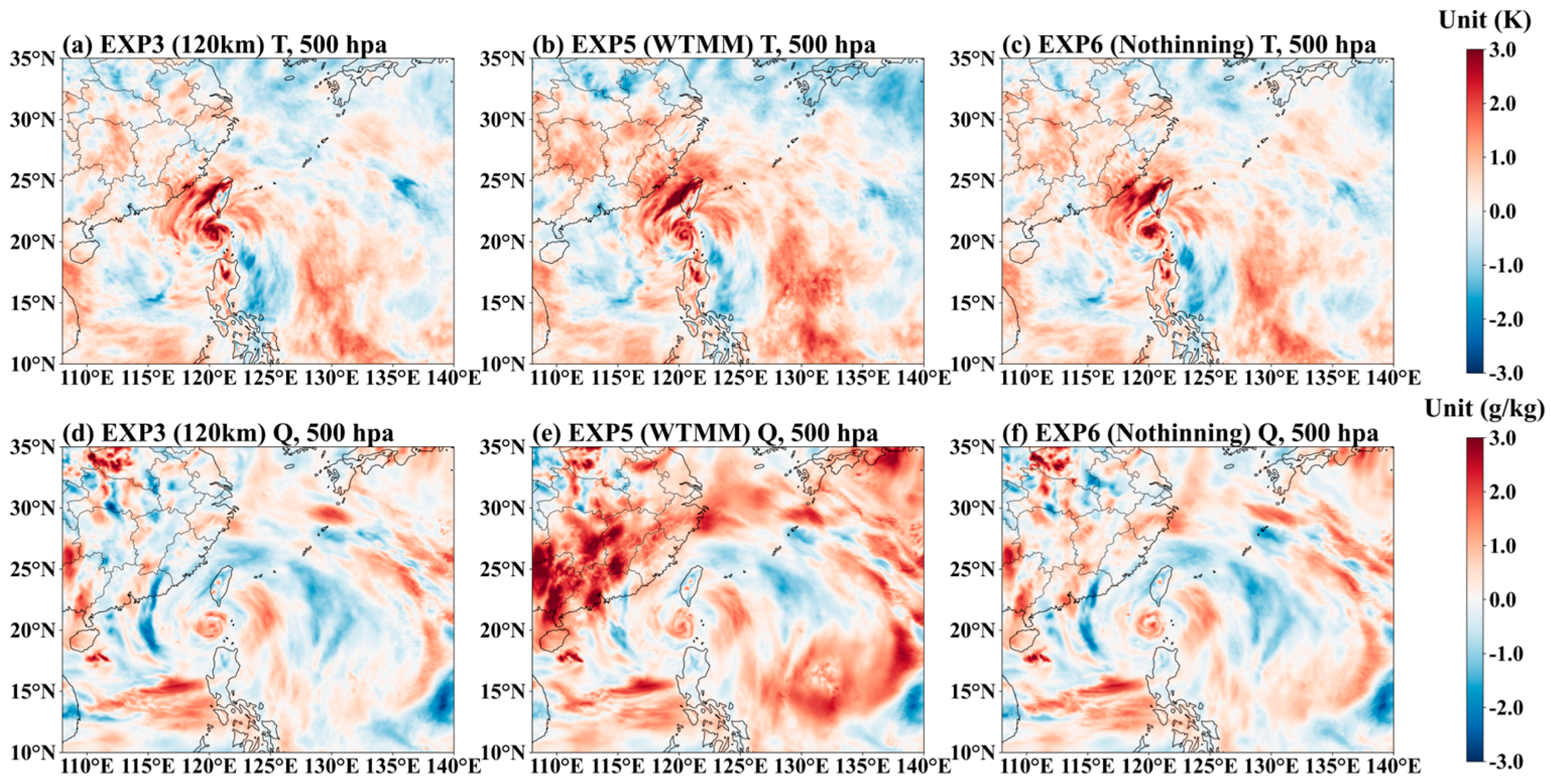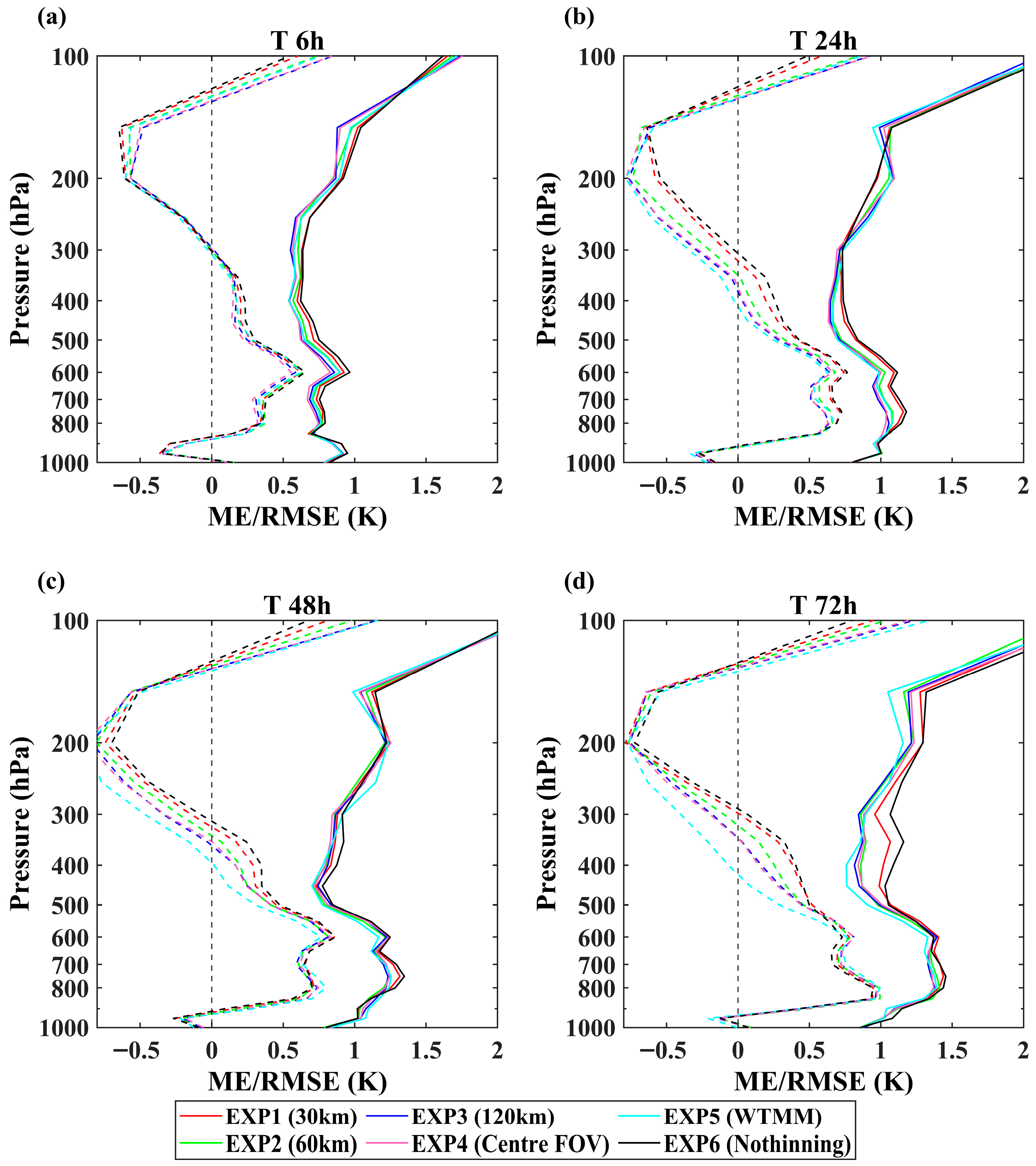 - The no thinning scheme has the largest MEs and RMSEs at all pressure levels for temperature and humidity forecast fields at different forecast times, shown by cycling assimilation and forecast experiments. The temperature forecast errors after data thinning are decreased at altitudes below 300 hPa, with similar accuracy between the WTMM and 120 km schemes. The EXP3 (WTMM) scheme is gradually superior, with forecast time increasing.