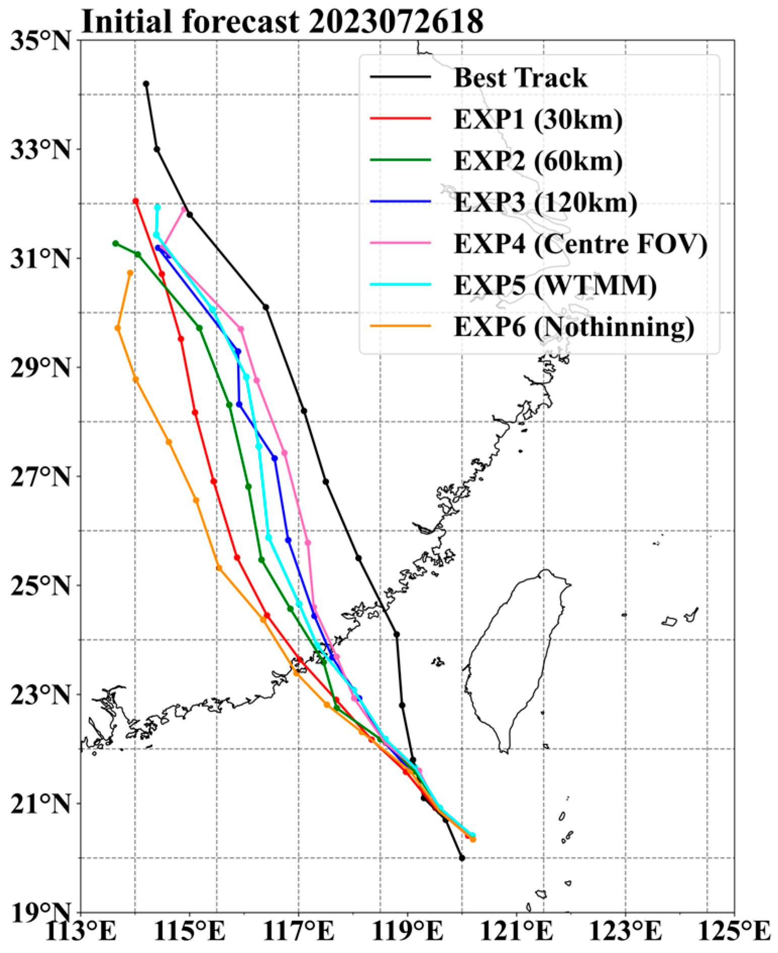 - The intensity forecasts are underestimated before the typhoon landfall but begin to be overestimated after landfall for all schemes. The forecast intensities of the WTMM scheme are closest to the actual observations as the forecast time increases. The typhoon track error forecasted by the no thinning scheme is the largest, and the errors gradually decreased after 48 h by WTMM.