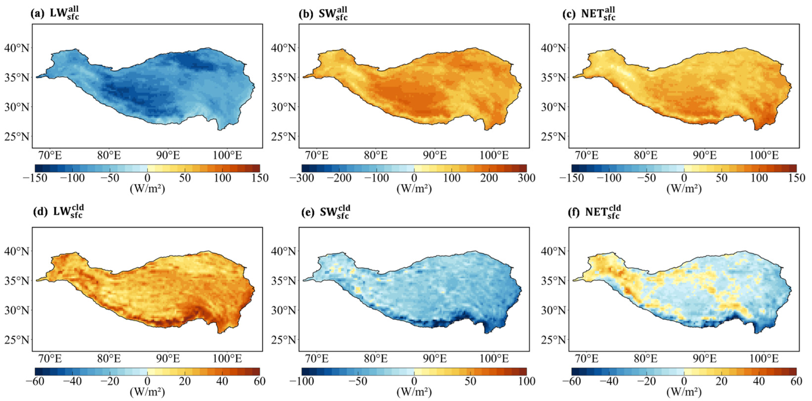 Spatial distribution of the multi-year (2001–2023) mean surface radiation budget over the TP: (a) all-sky net longwave radiation, (b) all-sky net shortwave radiation, and (c) all-sky net radiation; and the cloud radiative forcing: (d) longwave, (e) shortwave, and (f) net.