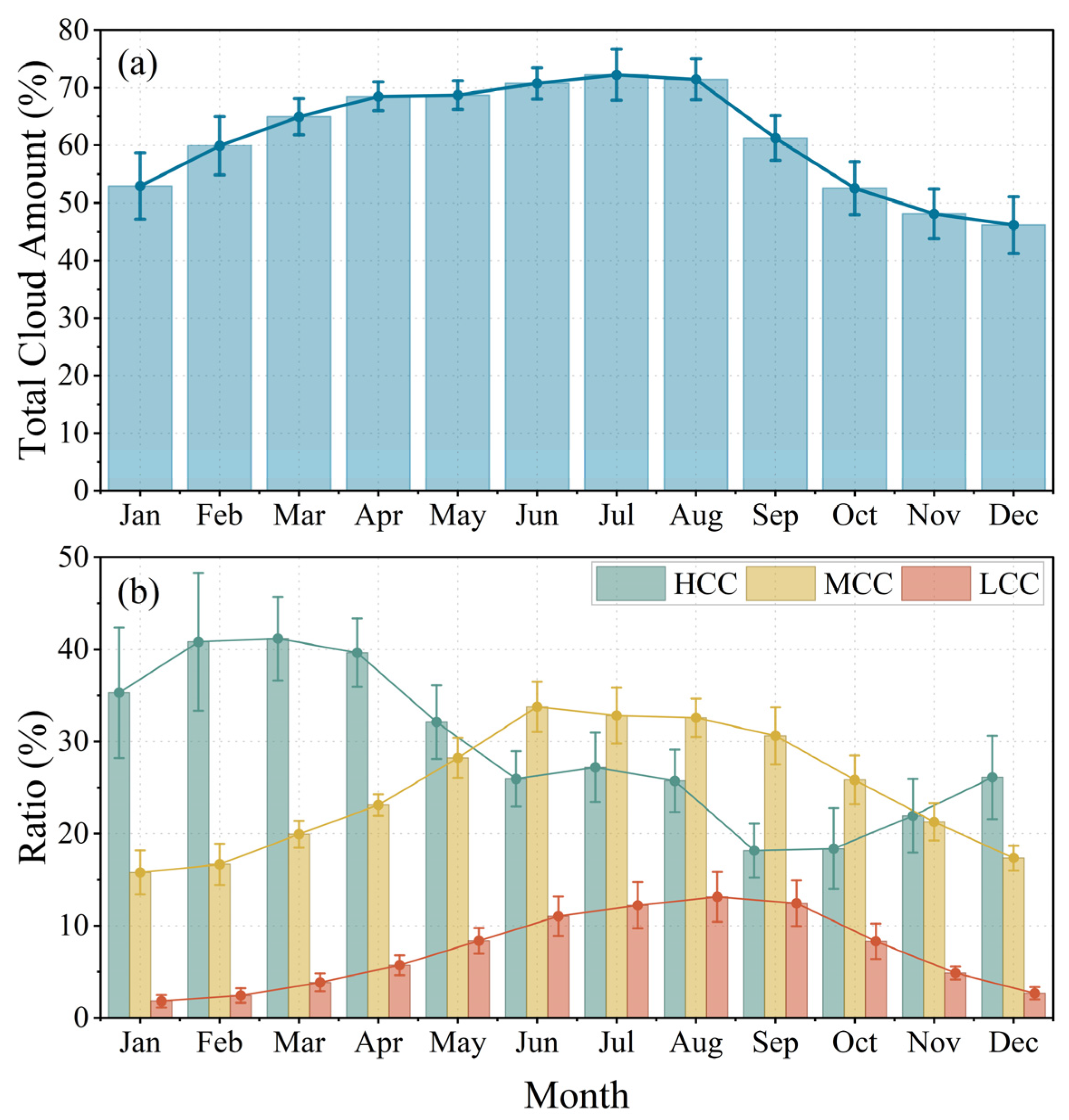 Seasonal cycle of (a) total cloud cover (TCC) and (b) the contribution of HCC, MCC, and LCC to TCC over the TP.