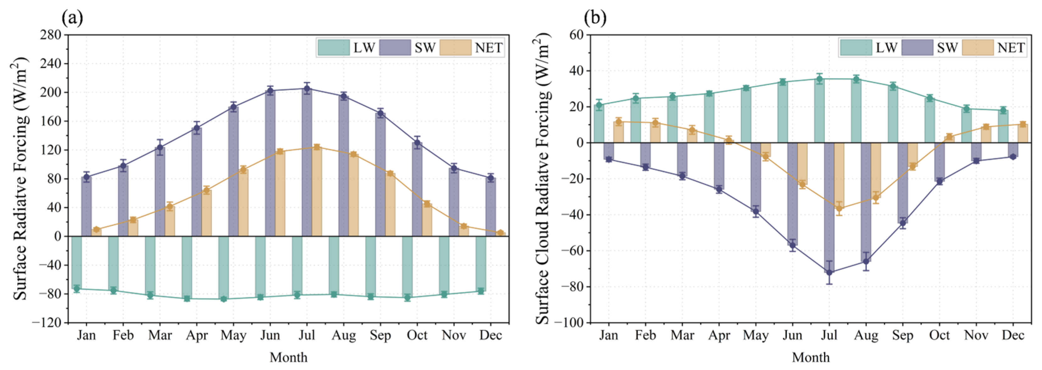 Seasonal cycle of the (a) surface radiation budget and (b) surface cloud radiative forcing over the TP.