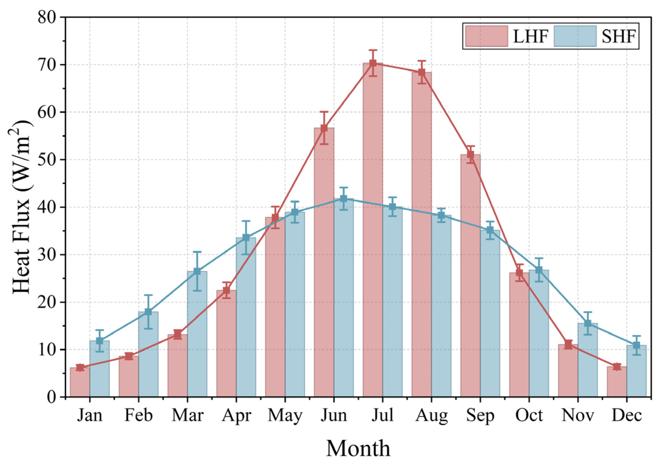 Seasonal cycle of Latent Heat Flux (LHF) and Sensible Heat Flux (SHF) over the TP.