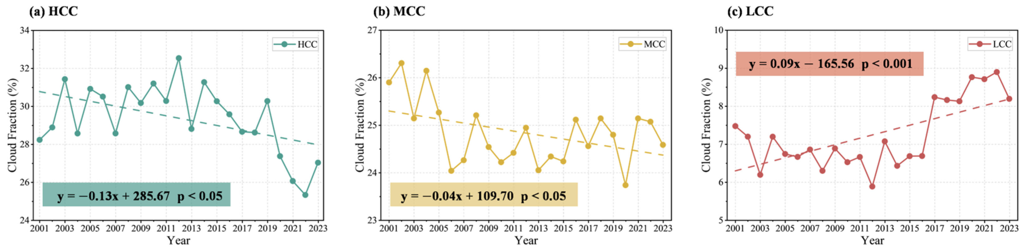 Interannual variation of (a) HCC, (b) MCC, and (c) LCC over the TP during 2001–2023.
