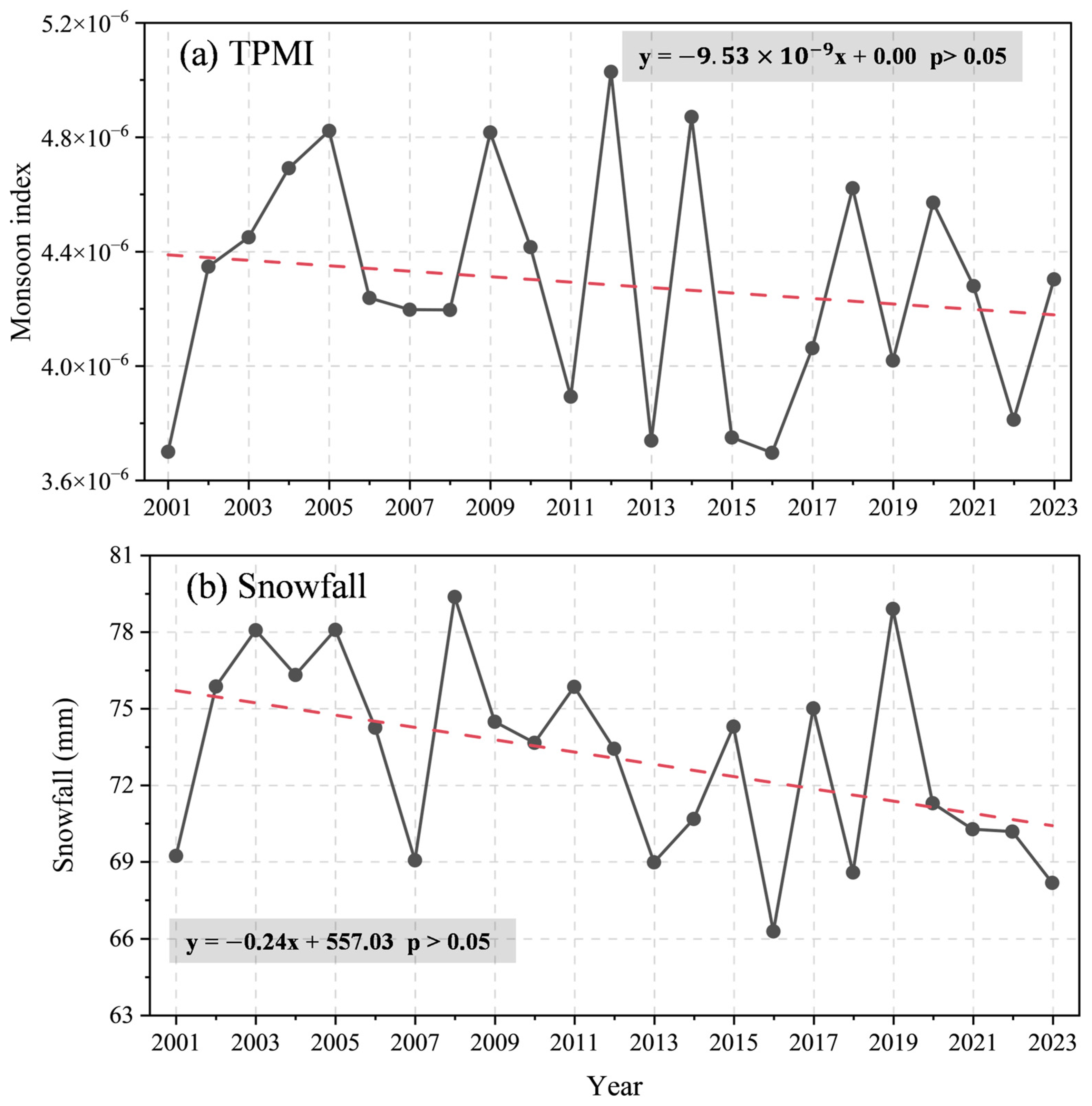 Interannual variation of (a) TPMI and (b) snowfall over the TP during 2001–2023. The red dashed line denotes the linear trend.