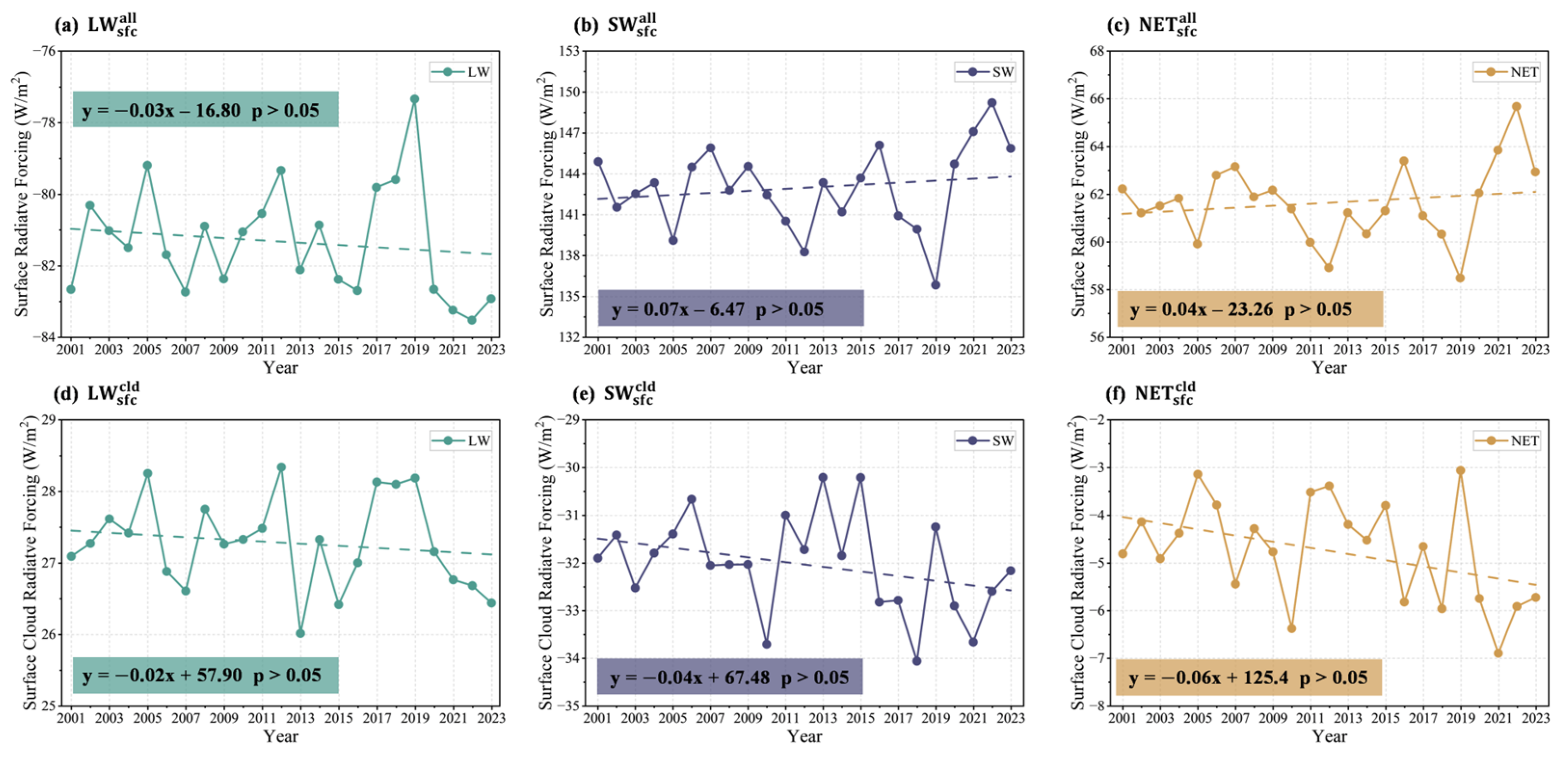 Interannual variations (2001–2023) over the TP: (a) net longwave radiation, (b) net shortwave radiation, and (c) net radiation; and the cloud radiative forcing: (d) longwave, (e) shortwave, and (f) net.