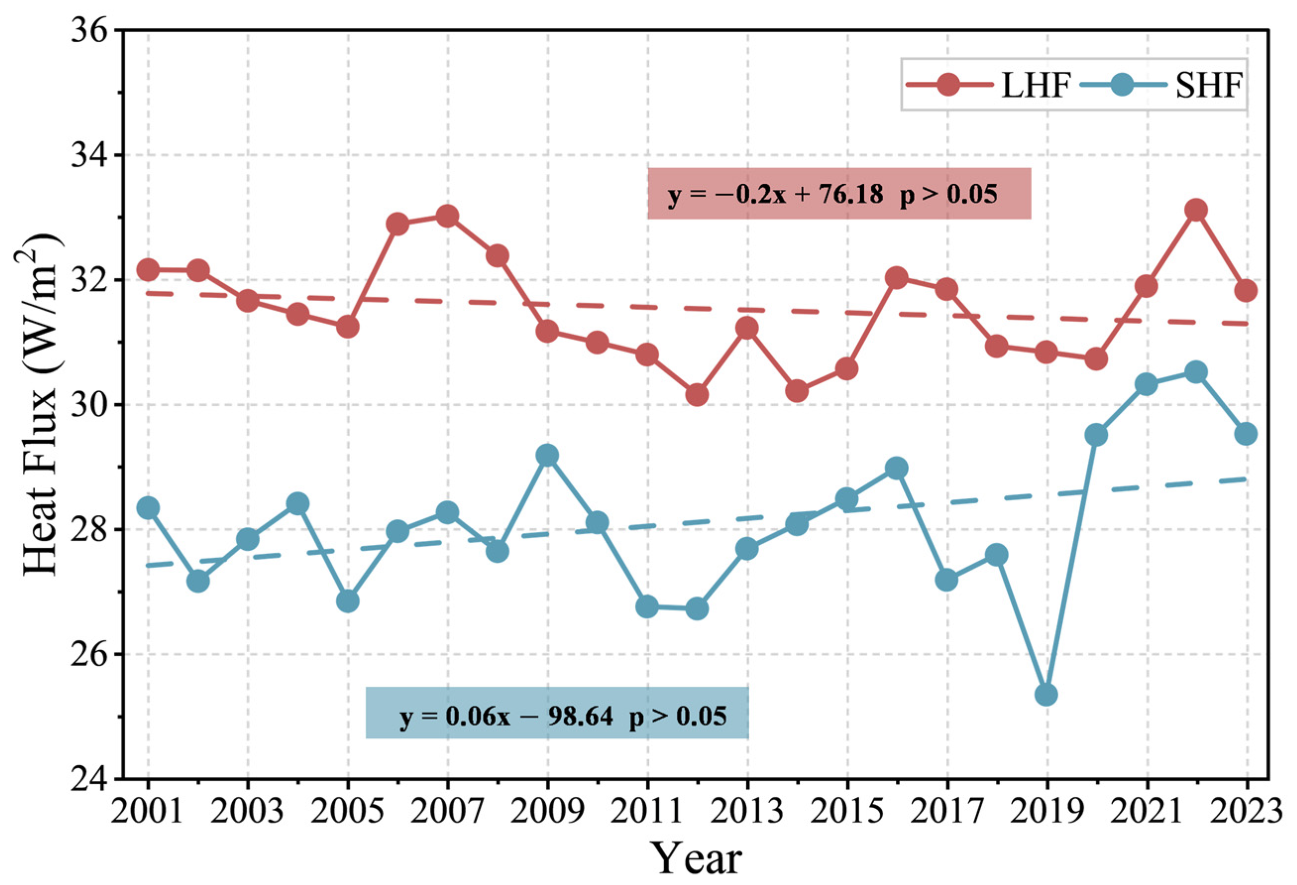 Interannual variation of LHF and SHF over the TP during 2001–2023.