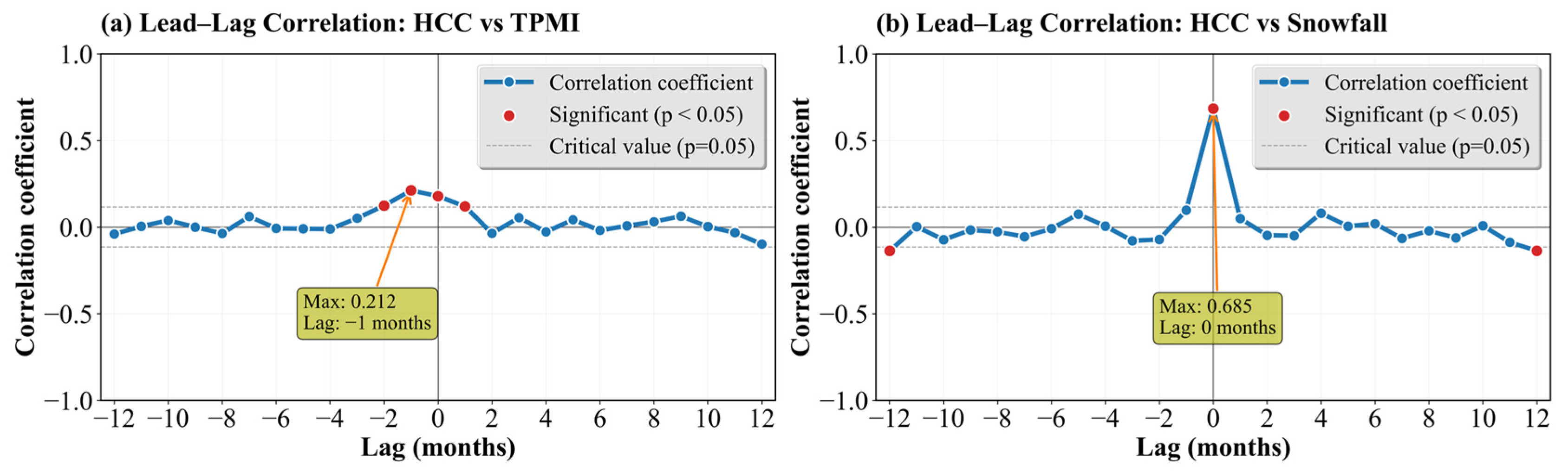 Lead–lag correlation between the HCC and (a) TPMI and (b) Snowfall.
