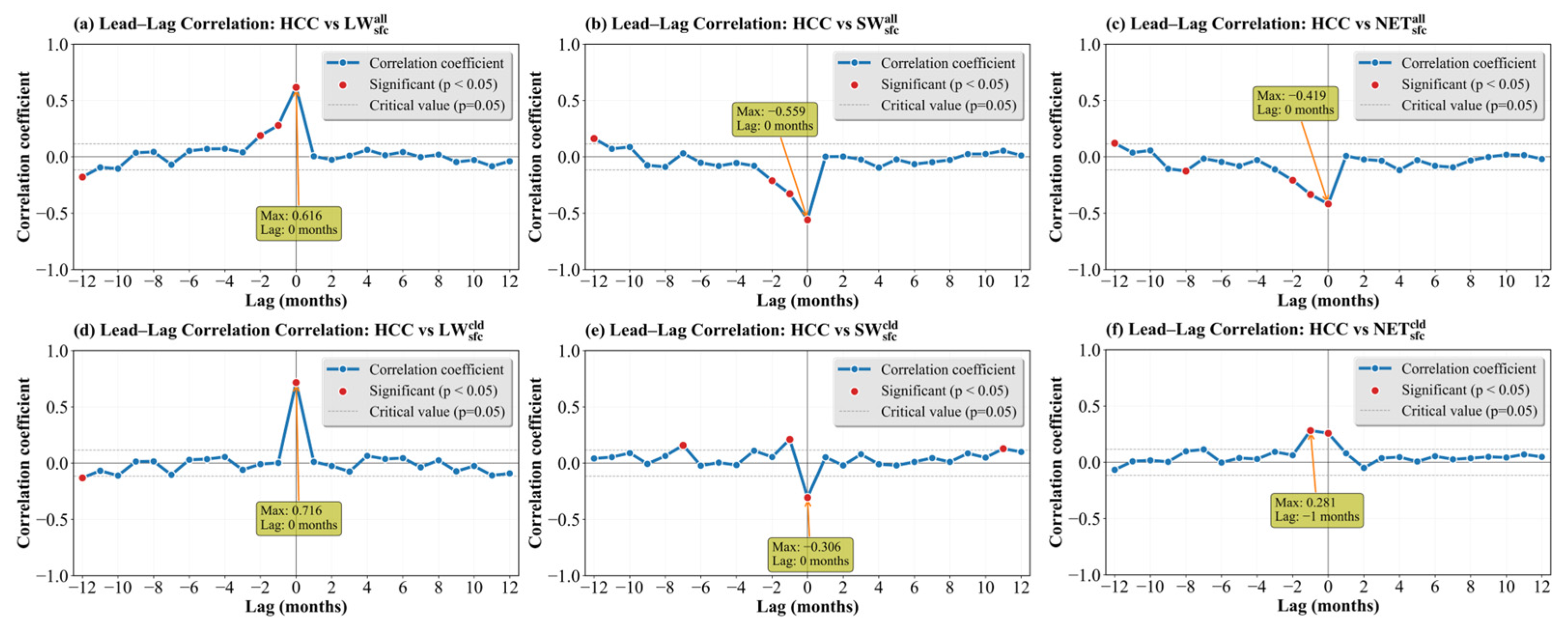 Lead–lag correlation of HCC with (a) all-sky net longwave radiation (), (b) all-sky net shortwave radiation (), (c) all-sky net radiation (), (d) longwave cloud radiative forcing (), (e) shortwave cloud radiative forcing (), and (f) net cloud radiative forcing ().