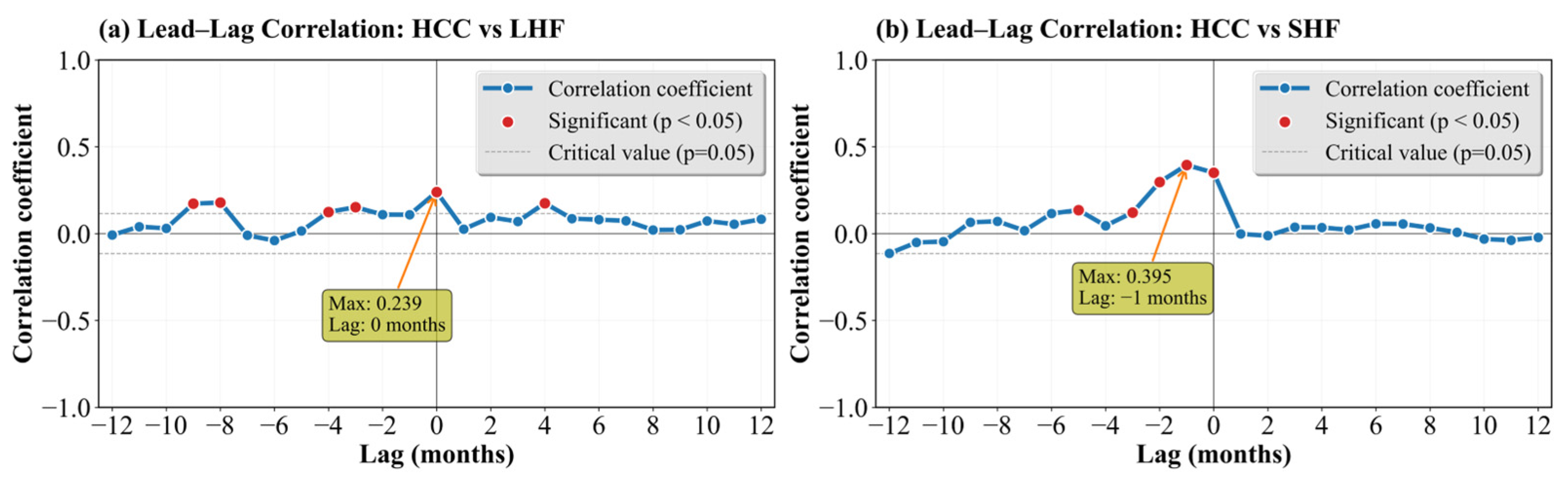 Lead–lag correlation between the HCC and (a) LHF and (b) SHF.