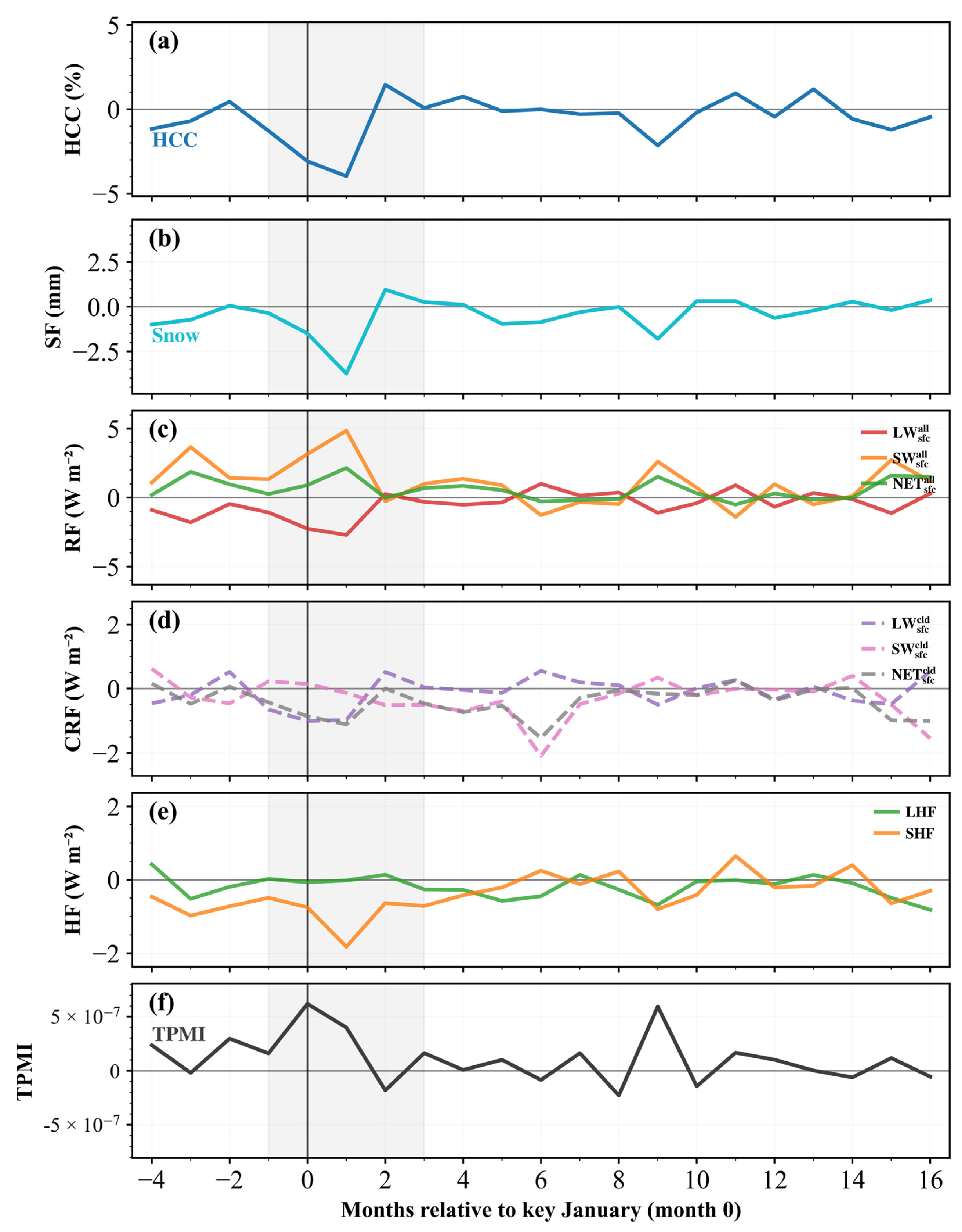 Composite evolution of key climatic variables following winter HCC reduction over the TP: (a) HCC, (b) snowfall (SF), (c) all-sky surface radiative fluxes (RF), (d) surface cloud radiative forcing (CRF), (e) sensible and latent heat fluxes (HF), and (f) the Tibetan Plateau Monsoon Index (TPMI).