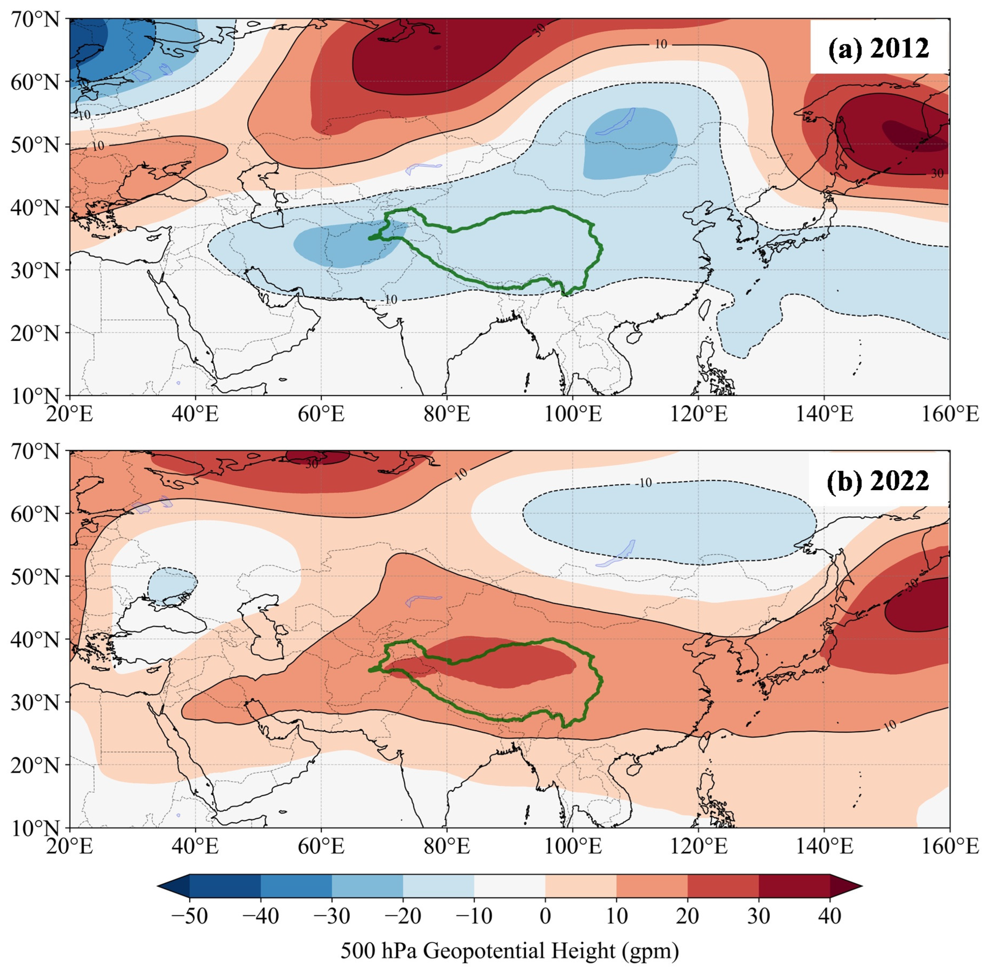 Comparison of the 500 hPa geopotential height over the TP and surrounding regions during the summer monsoon season for (a) 2012 and (b) 2022. The green line delineates the boundary of the TP.