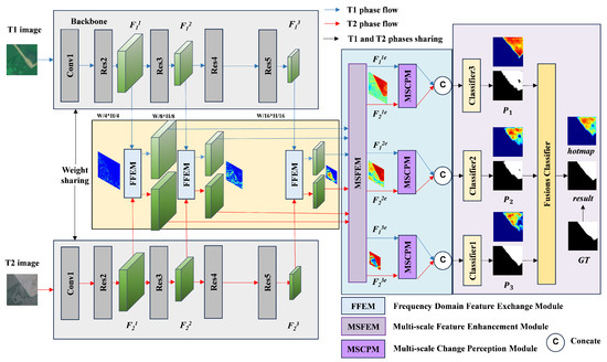 - Guo, Z.; Chen, H.; He, F. MSFNet: Multi-scale Spatial-frequency Feature Fusion Network for Remote Sensing Change Detection. IEEE J. Sel. Top. Appl. Earth Obs. Remote Sens. 2024, 18, 1912–1925. [Google Scholar] [CrossRef]